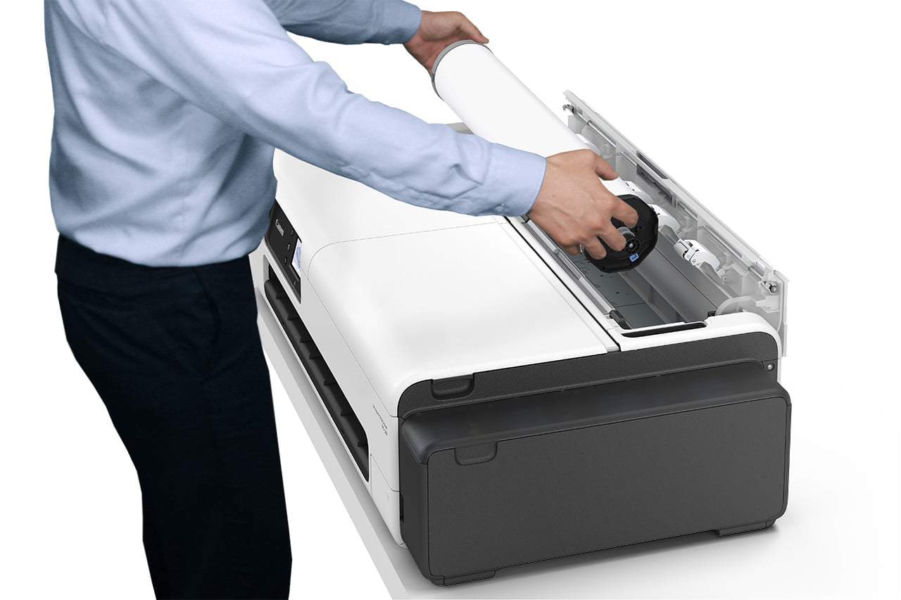 The Canon imagePROGRAF TC-20M is easy to operate: ink refills, paper loading and maintenance are all accessible from the front. The easily recyclable ink bottles (new black, cyan, magenta and yellow pigment inks) contain 70ml of ink, reducing the refill frequency and total cost of ownership. The built-in large capacity ink tanks are easily accessible from the front side of the printer, and can be refilled without dirtying hands or clothing. The shaft-less roll holder makes roll paper loading effortless, and reduces the amount of space needed for the printer.