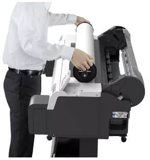 The Canon imagePROGRAF TM-240 large format printer accepts roll and cut media with a thickness range of 0.07 to 0.8mm. The minimum print length is 203mm, and the maximum print length for roll paper is 18 meters, and cut sheet up to 1.6 meters. The maximum media roll diameter is 150mm.