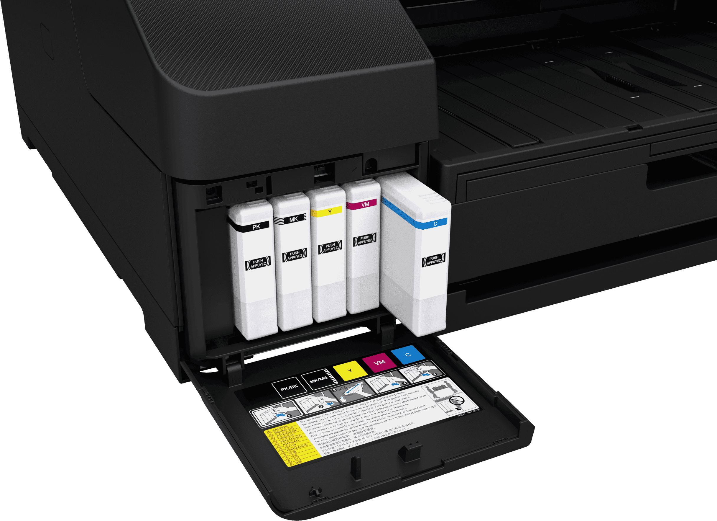 The Epson 10-channel Micro Piezo printhead configuration uses 180 nozzles for black and 180 nozzles per colour and includes a dedicated PK/MK channel, eliminating the switching required in previous generation printers, and delivering “always on” channels for Photo Black and Matte Black ink saving time and ink for usage of different media surfaces. The Epson Micro Piezo printhead delivers a variable-sized droplet technology with a minimum droplet size of 1.5 picoliters.