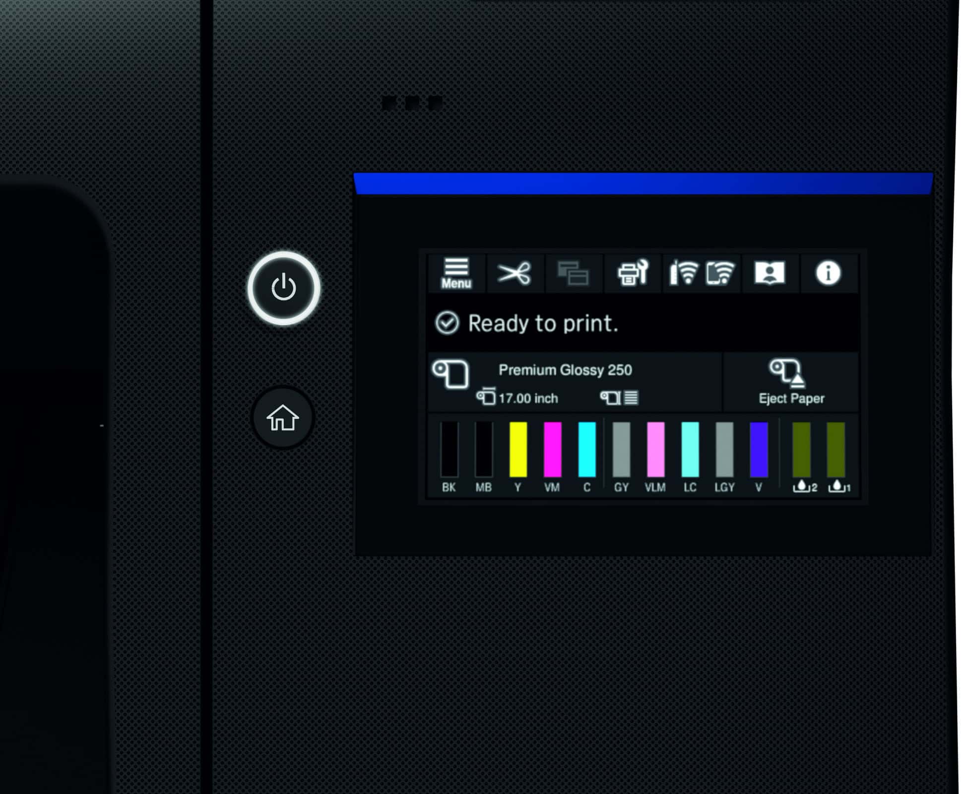 The Epson SC-P5300 includes a 4.3 inch/10.8 cm colour LCD touchscreen on the front of the printer, making it easier to check printing progress from a distance. It’s more convenient if the user has to watch several printers, and features customizable background colour for better readability, and customizable layout, to fullfil user needs.