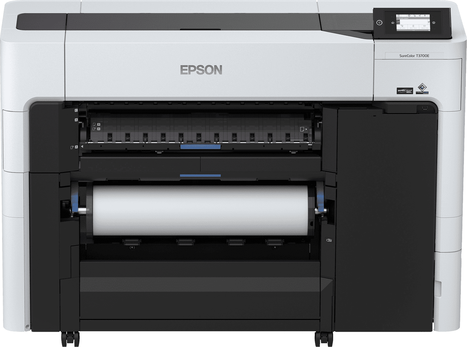 The Epson SureColor SC-T3700 Series has a versatile design which makes this printer an ideal fit for most offices. Compact, its ideal for small spaces, and its flat top surface is ideal for editing and as a proofing bench. Front operation means the printer can be placed up against a wall, maximising floor space. Front access to the roll holders, ink cartridges, maintenance box and integrated print catch basket aid in operation and make it easy to use in a variety of environments. The Integrated Print Catch Basket is simple and effective, and folds away completely saving space when not in use. The Epson SureColor SC-T3700E features a durable built-in rotary paper cutter which cuts prints quickly and cleanly. The SC-T3700E features a tilting 4.3 inch/11 cm touch screen user interface .