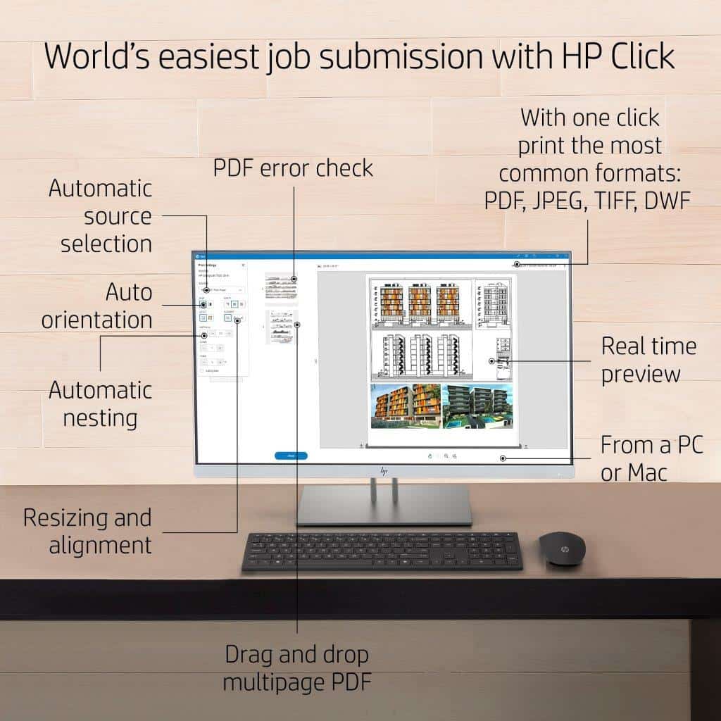 HP Click is a one-click desktop (Windows/Mac) printing (Windows/Mac) software which gives you confidence to print right the first time. HP Click enables printing directly from the computer or laptop connected to HP DesignJet T600 Series Printers. Speed up the PDF printing process with included HP Click software and optimise media usage and costs. HP Click enables one-click multi-size printing of JPEG, PDF, TIFF, HP-GL/2 and DWF files and features batch and nest job printing, real print preview, automatic rotation, PDF error check, and save media with automatic nesting. HP Click remembers last setting, and a multi-installation version is available for IT managed environments.