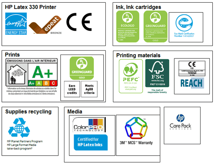 Since 1992, HP focuses on specific environment impacts through its Design for Environment (DfE) program. DfE is an engineering perspective where the environmentally related characteristics of a product, process, or facility are optimized. Together, HP’s environmental stewards and product designers consider impact on the design of every product and solution, from the smallest ink cartridges to entire data centres. HP Latex Printing Technologies provide many opportunities to reduce and recycle. Below are the certifications for the HP Latex 300 Series Printers, HP 831 Latex Ink Cartridges, and selected HP Media.