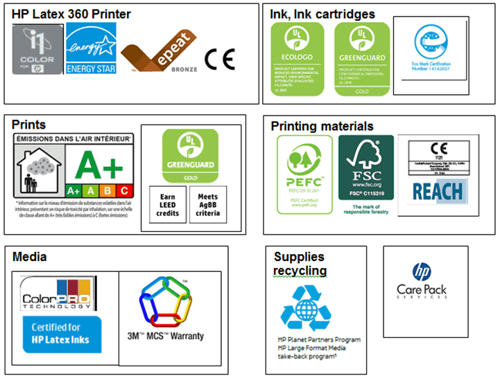 Since 1992, HP focuses on specific environment impacts through its Design for Environment (DfE) program. DfE is an engineering perspective where the environmentally related characteristics of a product, process, or facility are optimized. Together, HP’s environmental stewards and product designers consider impact on the design of every product and solution, from the smallest ink cartridges to entire data centres. HP Latex Printing Technologies provide many opportunities to reduce and recycle. Below are the certifications for the HP Latex 300 Series Printers, HP 831 Latex Ink Cartridges, and selected HP Media.
