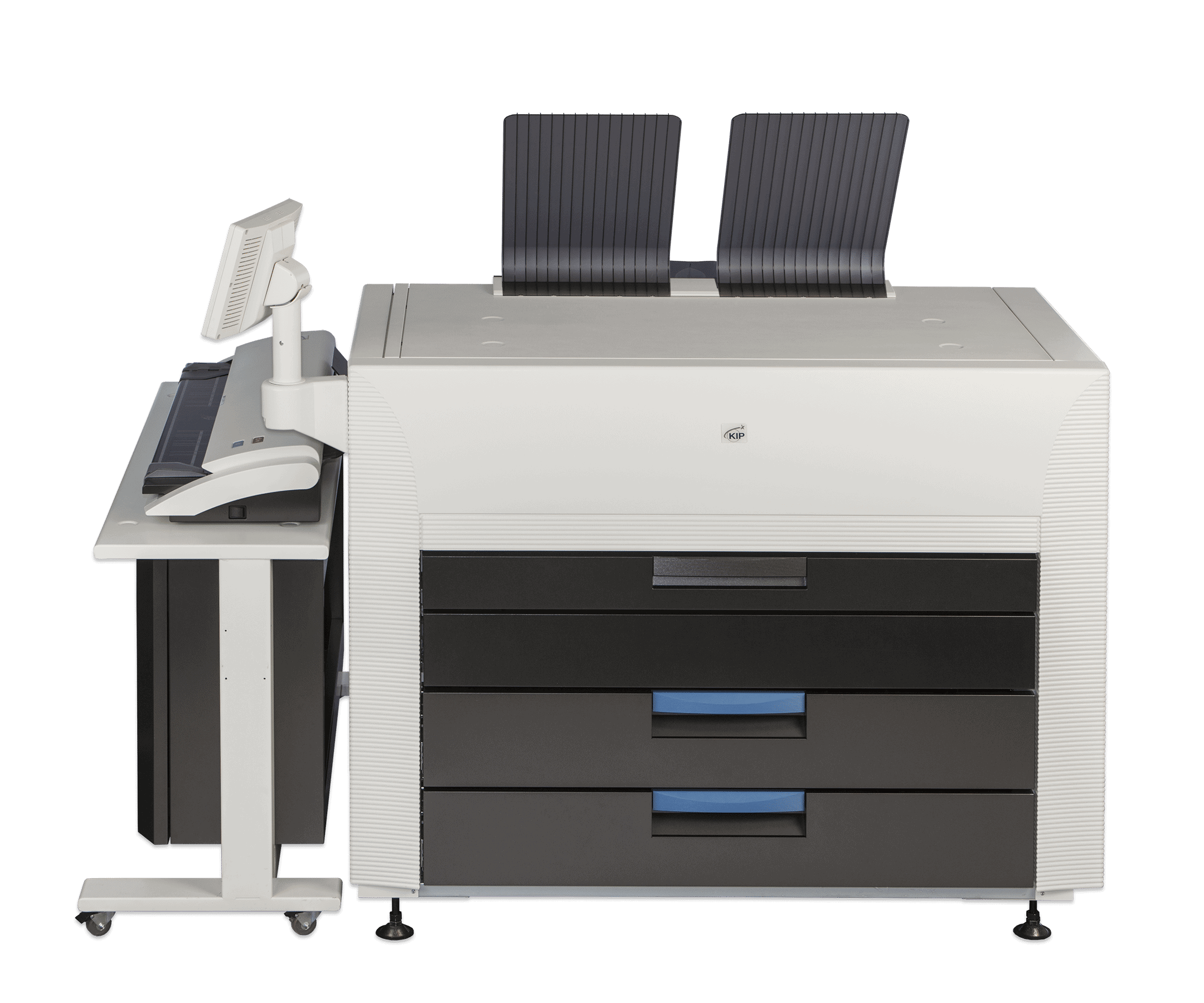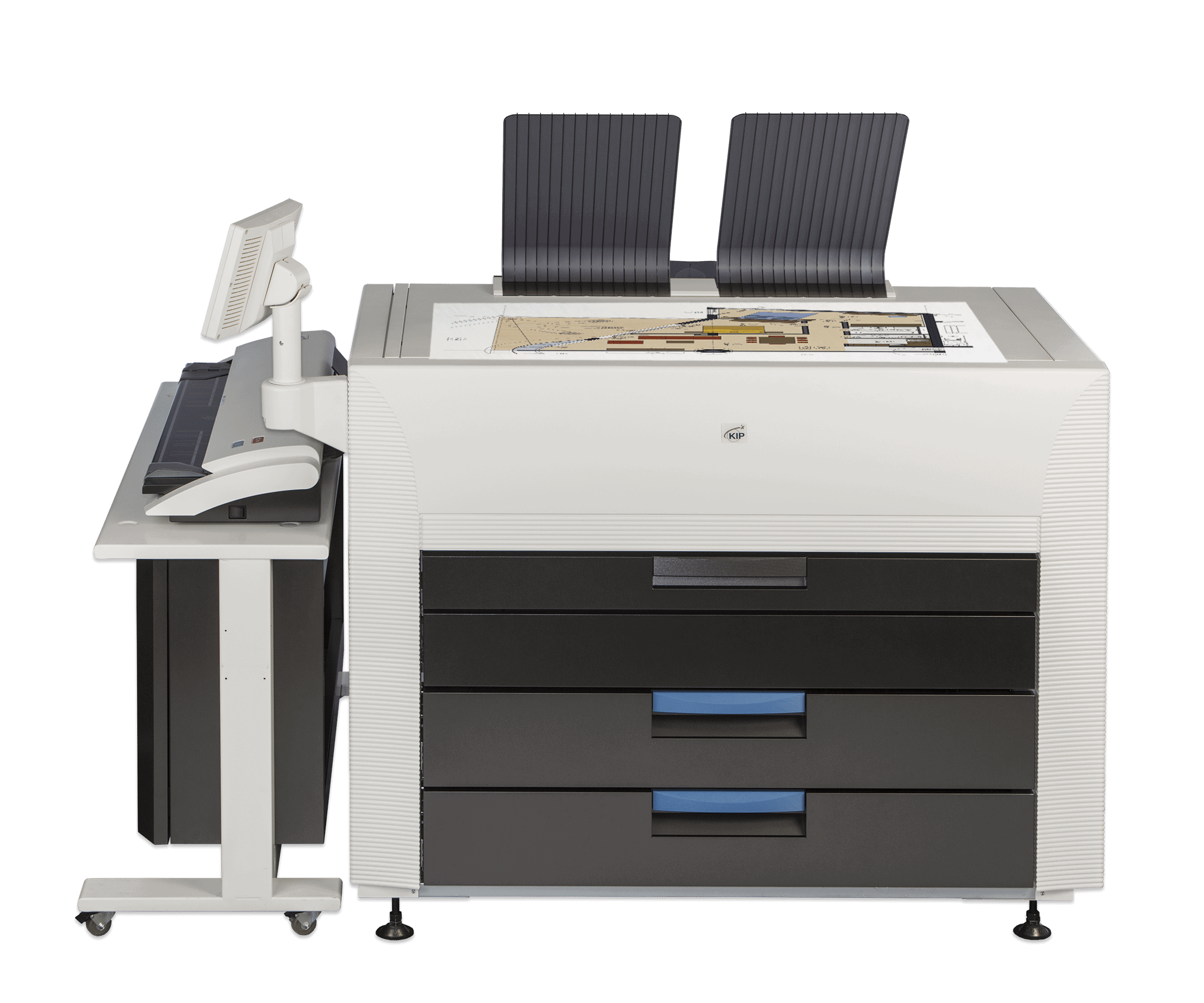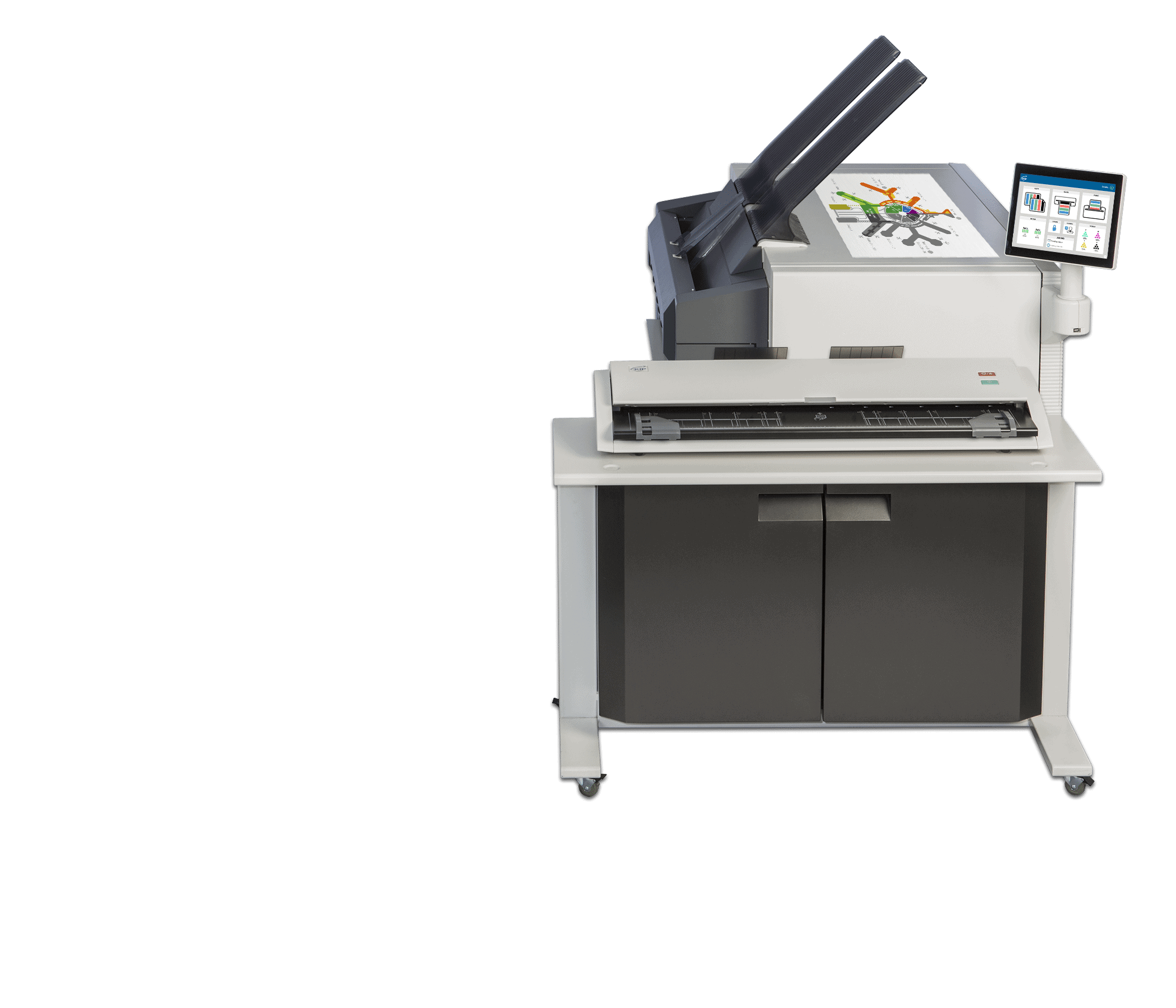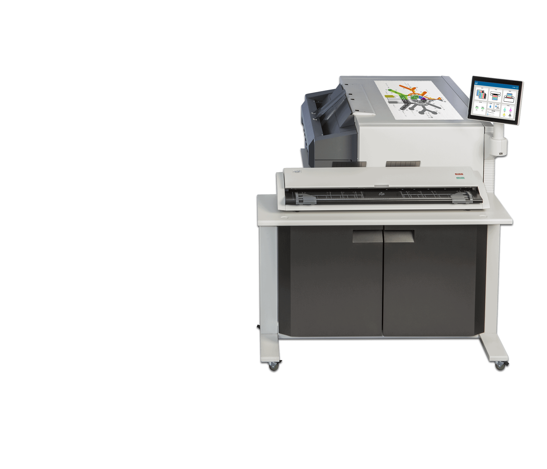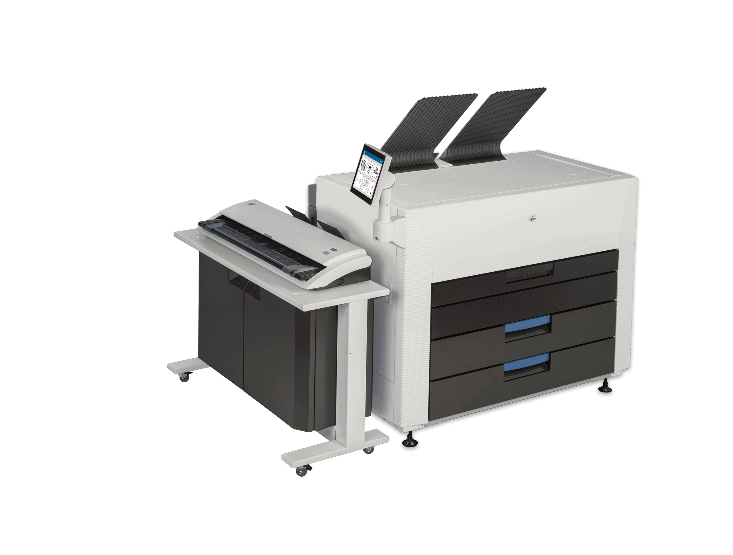 The KIP 890 multi-function printer with the KIP 2300 Scanner system. The KIP 890 delivers unmatched multi-function copy, scan and print performance for high demand enterprise workflow. Engineered to deliver vibrant, consistent colour quality from first to final print. The integrated dual footprint configuration multitasks scan and print production, saving valuable project time. Smart touchscreen automation simplifies complex copy, scan and print processes for single touch control.The KIP 890 multi-function system includes the integrated KIP 2300 CCD Scanner.