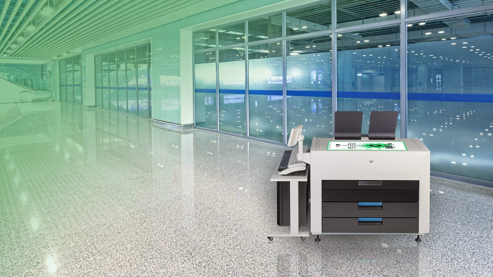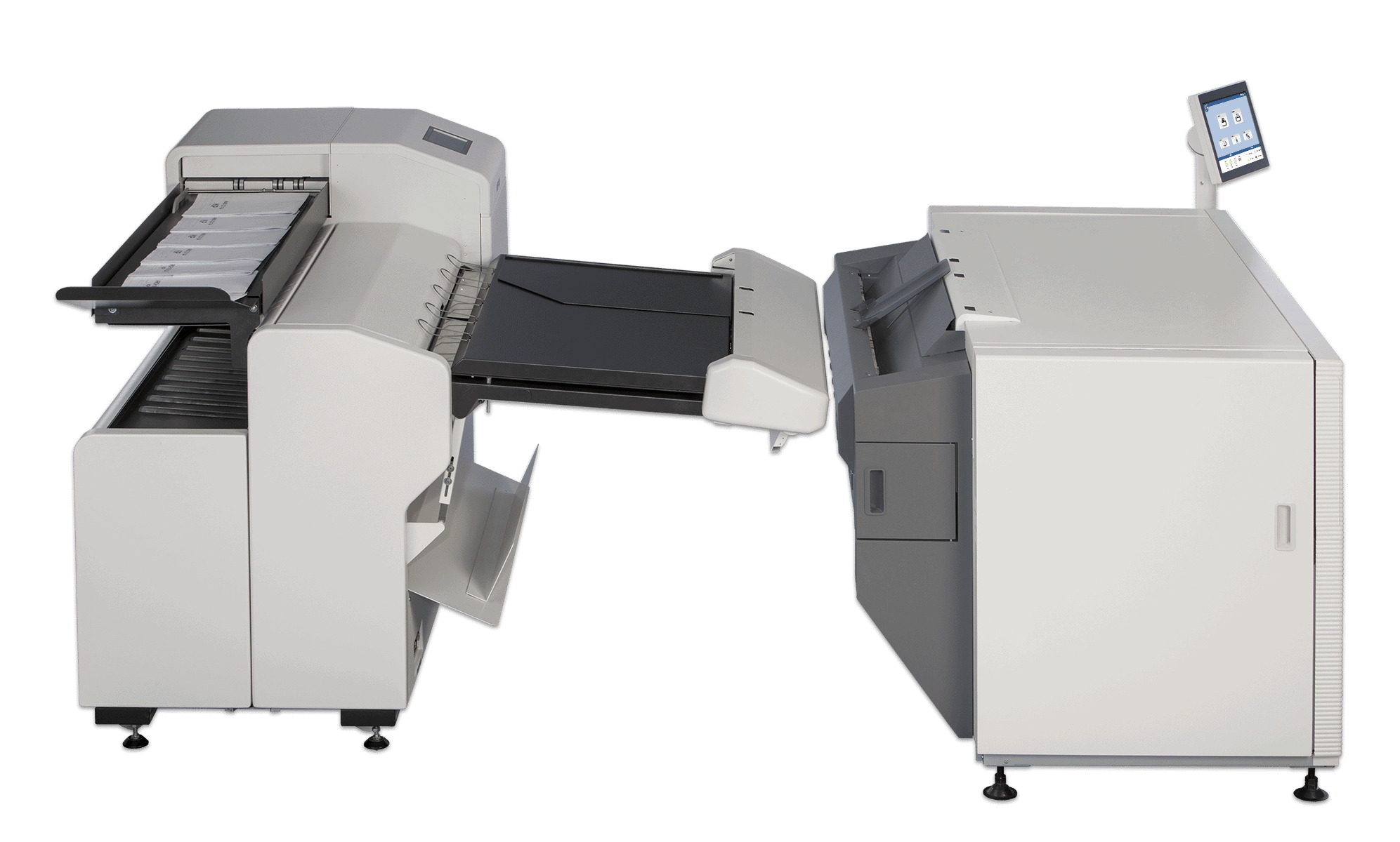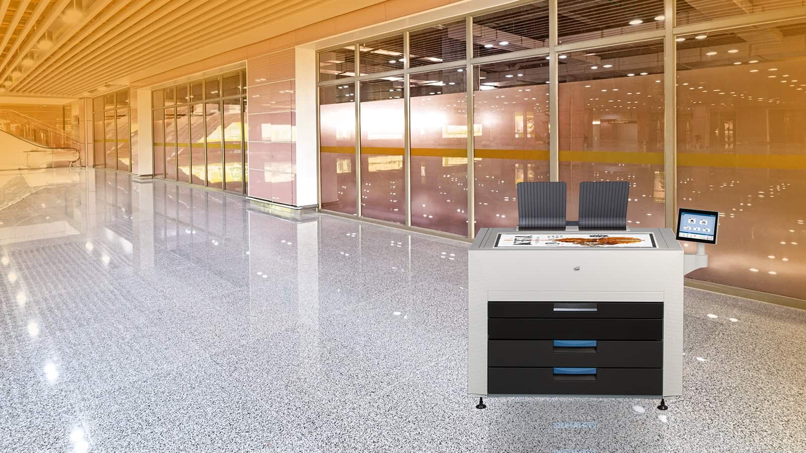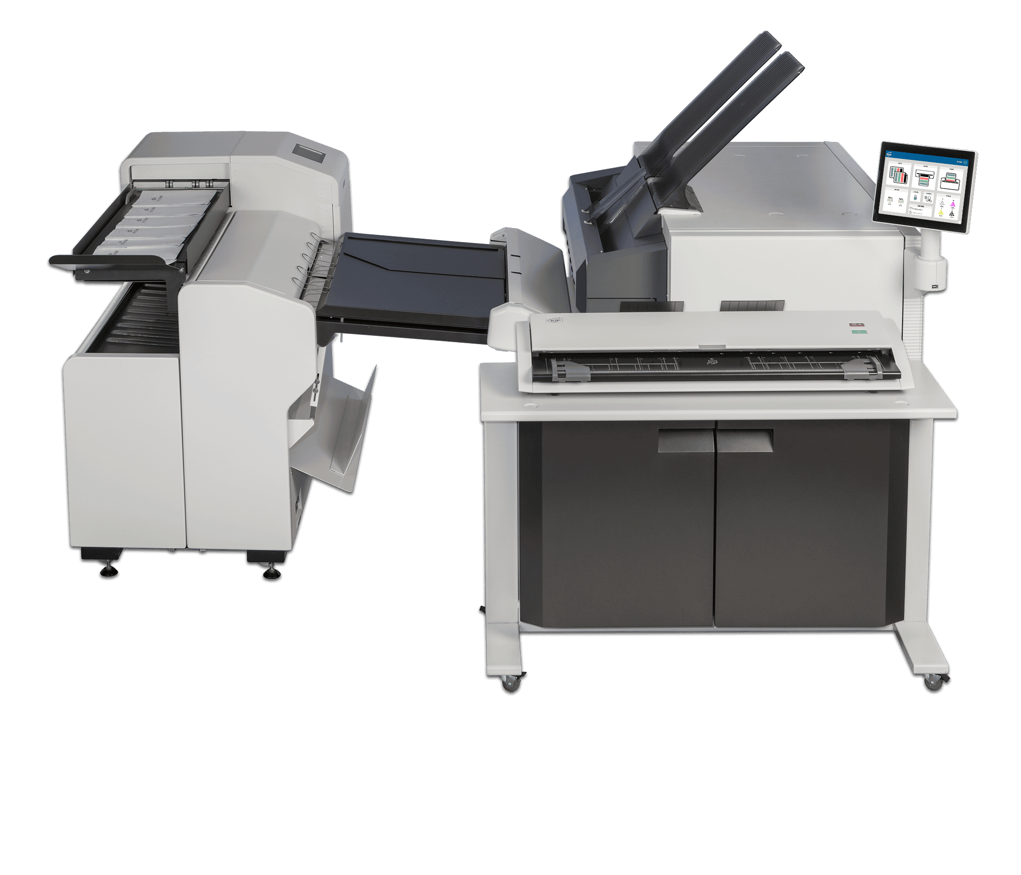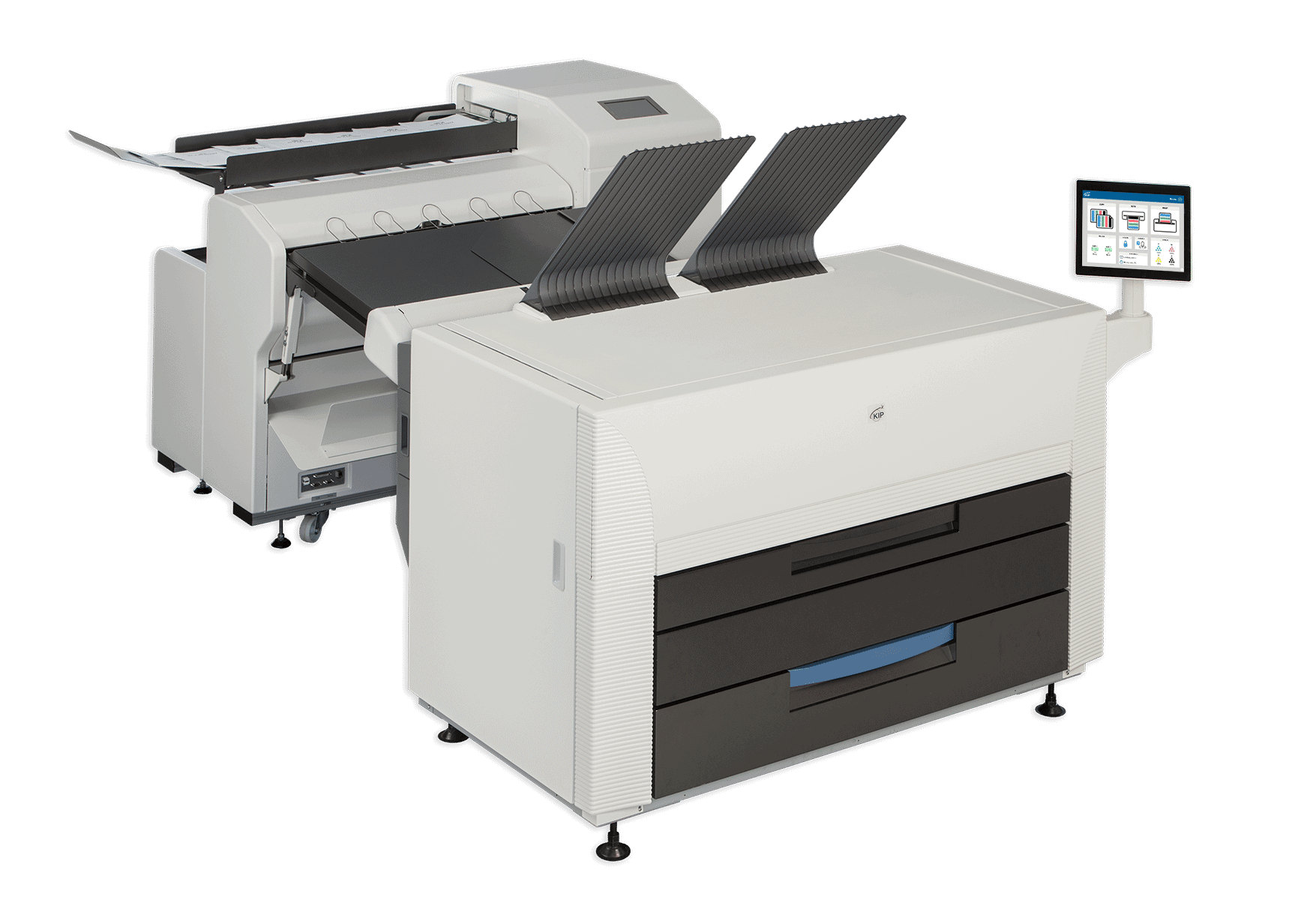 The KIP 890 multi-function printer with the KIP 2300 Scanner system. The KIP 890 delivers unmatched multi-function copy, scan and print performance for high demand enterprise workflow. Engineered to deliver vibrant, consistent colour quality from first to final print. The integrated dual footprint configuration multitasks scan and print production, saving valuable project time. Smart touchscreen automation simplifies complex copy, scan and print processes for single touch control.The KIP 890 multi-function system includes the integrated KIP 2300 CCD Scanner.