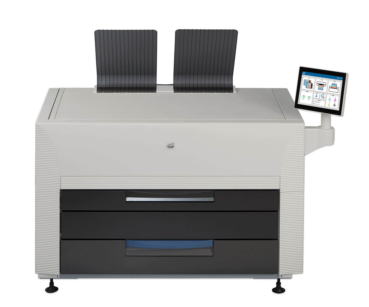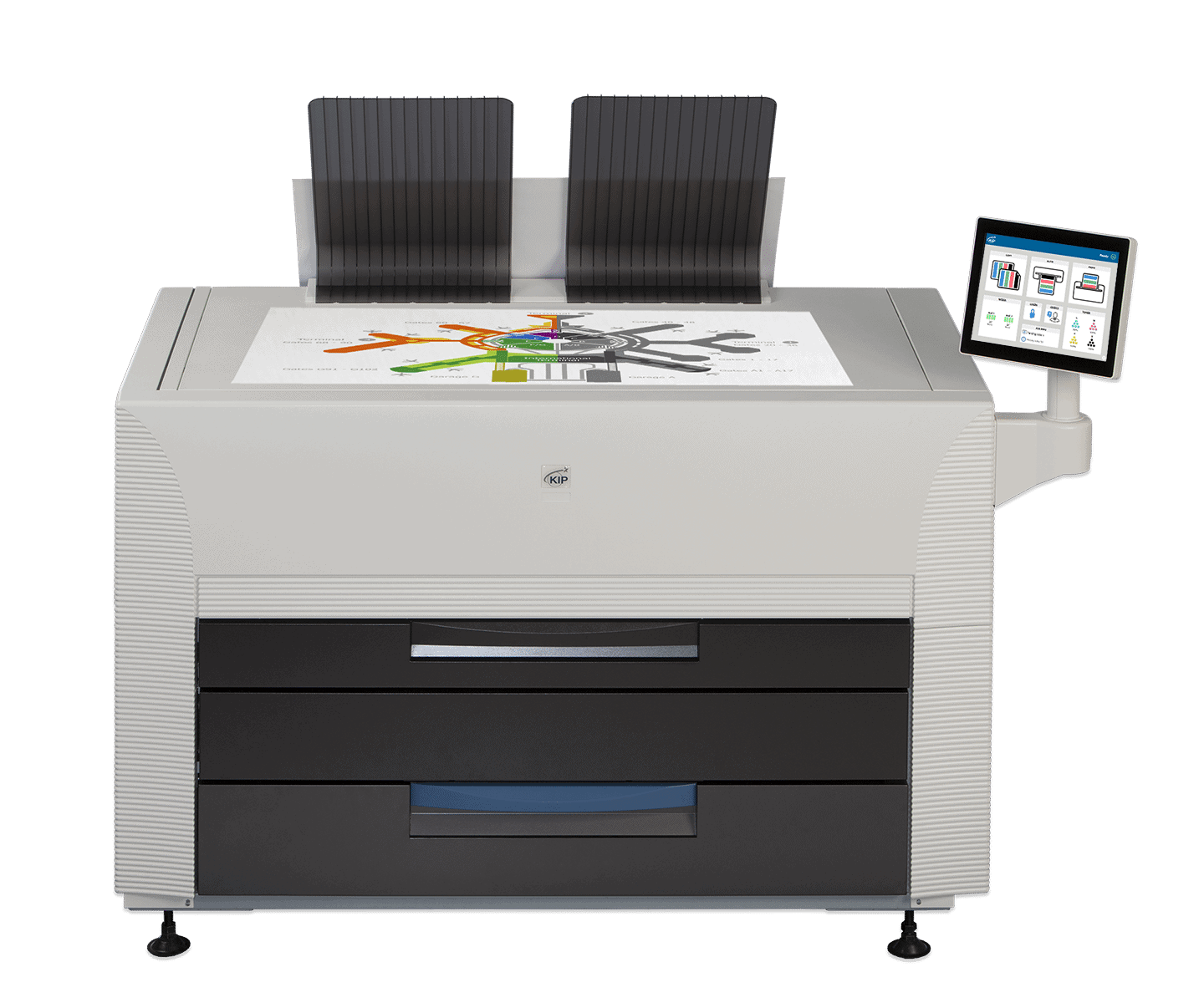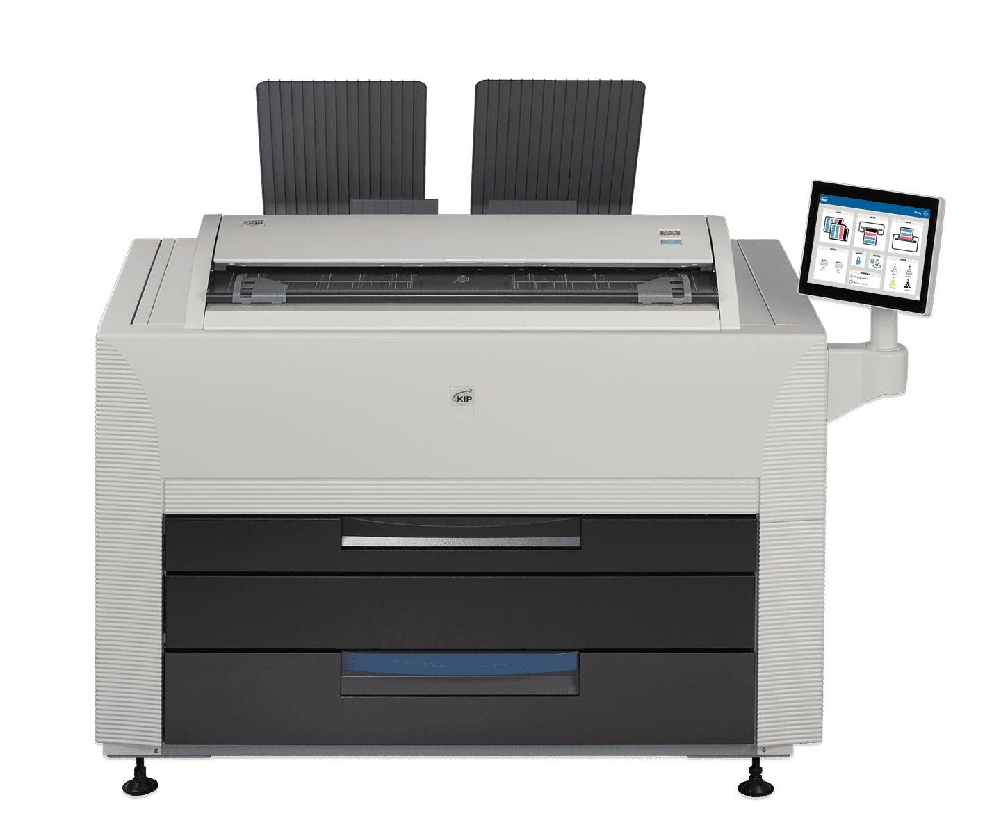 The KIP 860 multi-function system is is ideal for environments that require convenient multi-function productivity with a single footprint space-saving design. The KIP 860 colour print system provides extraordinary print quality and performance for both colour and black & white wide format printing of technical and business graphics. All system features and functions are at your fingertips using the intuitive touchscreen navigation that automates copy, scan and print functions for single touch productivity. The KIP 860 with an integrated high quality scanner, two media rolls and top/front image stacking allows busy environments to benefit from greater productivity and workplace efficiency without interruption.