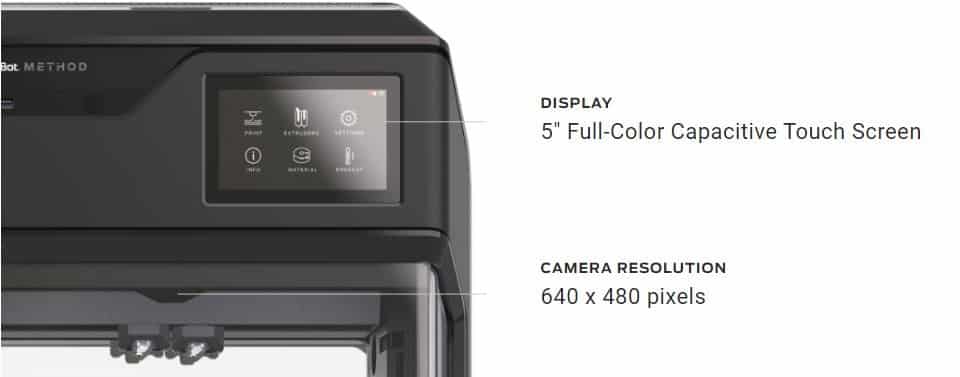 The MakerBot Method X 3D printer has a 5 inch touch screen, for easy, computer free access to printing menus, commands and your cloud storage library. The touch screen allows you to set up and maintain your 3D printer, preview print files, and easily access your object library. The touch screen shows how much filament remains, and lets you monitor your 3D Printer settings.