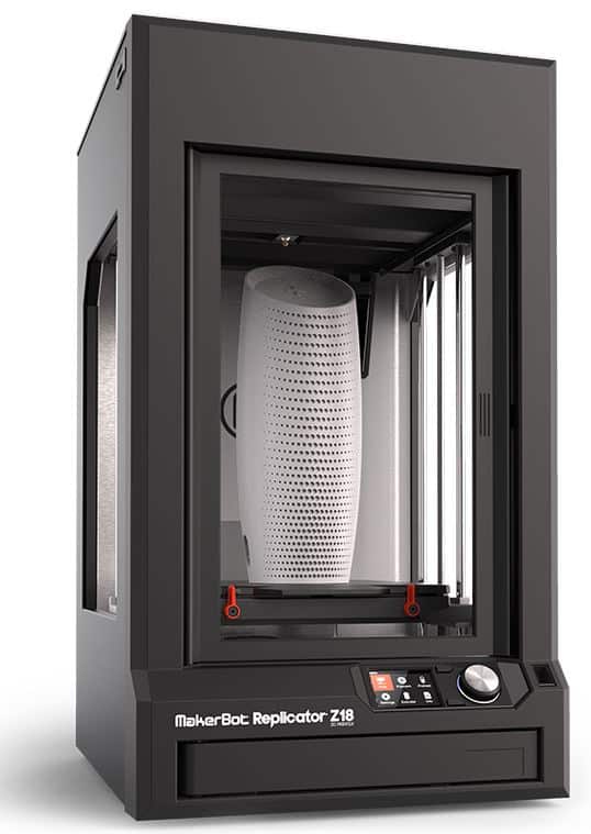 The MakerBot Replicator Z18 3D printer is reliable and delivers the best and most consistent results using compatible MakerBot PLA materials. When additional model strength and durability are required, MakerBot Tough material is available. MakerBot PLA materials will perform every feature that MakerBot Print software offers and reliably slices and prints every time. The Flex Build Plate is factory-leveled for immediate printing, right out of the box. The easy and accessible 3D printing experience features an on-board LCD display that show how much filament remains and enables monitoring of the 3D printer. The LCD supports 8 languages, including English, Spanish, Italian, French, German, Japanese, Korean and Chinese. The MakerBot Mobile and MakerBot Print app enable remote monitoring of the printing status. An on-board camera makes it easy to monitor print jobs, capture your creations being built, and share them online.