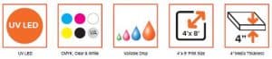 The Mutoh PerformanceJet VJ-2508UF LED UV Printer includes the Mutoh printer driver, which makes operation easy via a PC. Print directly without RIP software through the on-screen display using Adobe Illustrator, Windows Office, or CAD software. The Mutoh driver loads the image data and the Mutoh ValueJet Layer Editor Software enables the printing of up to three layers with various combinations at one time. Innovative layer printing function is exclusive to Mutoh and enables the changing of colours on the surface, to enrich the texture and enhance overall look of the print. Mutoh LED UV inks allow specialty finishes, by printing one layer for CMYK inks, white (only) or varnish (only). Printing three layers with colour, then white, then colour again can also be done, all at the same time. The use of layers creates an enriched layer appearance with incredible print quality and stability at a high speed on a variety of materials with a wide range of applications. Both flex and rigid inks are available. The hard UV ink bonds with many different materials, and in some cases, may require pre-coating. Printing on fairly flexible synthetic materials is not a problem because the layer thickness of the standard CMYK print is fairly thin due to the curing method and the relatively small droplet size. If varnish and white are added, the layer thickness becomes more perceptible but remains limited, and enhances scratch resistance.