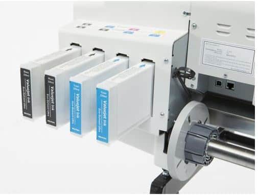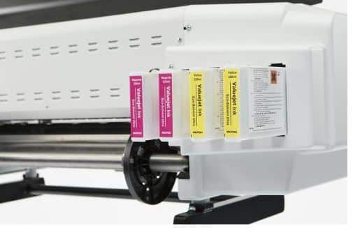 The Mutoh ValueJet VJ-628 comes as a desktop printer with integrated roll holders for media up to 9kg. The ValueJet VJ-628 handles both 2″ and 3″ core rolls. The printer incorporates three heater zones. The heating elements will pre-heat the media, fix the ink and dry the output.