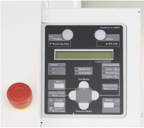 The Mutoh ValueJet VJ-426UF LED UV Printer includes an energy efficient long life LED UV curing lamp, ensuring output immediately dry and ready for use or second state treatment. The powerful long-life (14,250 hours) LED UV lamp is mercury and lead free, and ensures ozone free, safe and ultra-sharp prints, which are ready to be used or laminated after printing. The UV lamp is on the side of the printhead and travels quickly across the printing surface. The LED UV lamp does not create heat toward the media, making the technology extremely well suited for handling heat sensitive media as opposed to classic UV or water-based resin ink technologies generating huge amounts of heat or relying on high temperature to dry the ink. The UV light is only lit during actual printing. The distance between the UV light source is considerable, and lighting can be dosed, which means that the dose for the return run can be adjusted differently during be-directional printing, which prevents the so-called lawnmower effect. The large distance between the lamp and the print head allows for printing on mirrored surfaces without the UV light reaching the print head. Air cooling for the LEDs are located at the rear of the printer.