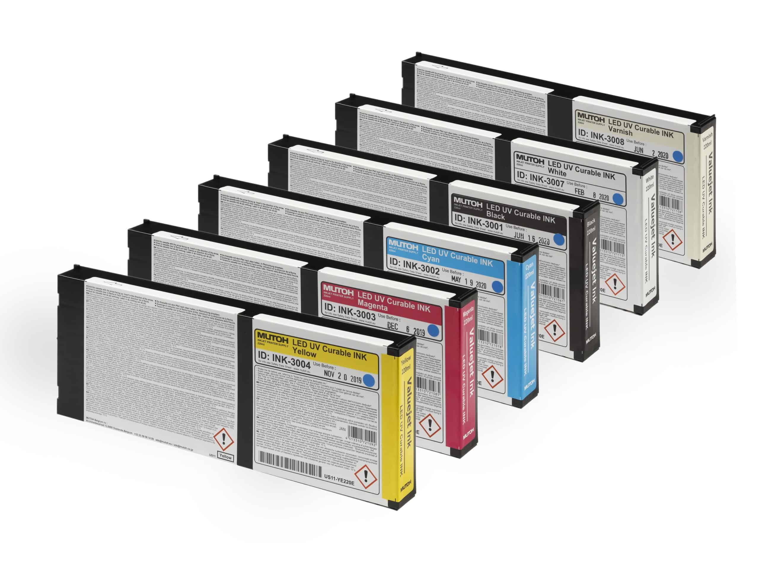 The XPJ-461UF is compatible with UH21/LUH Rigid and US11 Flexible LED UV Inks and includes C,M,Y,K, White, and Varnish. Mutoh LED UV inks enable printing on transparent and colour media with four colours and white and varnish, enabling printing on white, dark and clear items and objects and varnish inks enable spot varnish, structure printing and embossing. Available in 220 ml cassettes or 800 ml packs (500 ml white), Mutoh LED UV inks allow specialty finishes and the single print head setup for the XPJ-461UF A3+ UV LED Printer is optimised to work with Mutoh LED UV inks. LED UV Mutoh LED UV inks are zero VOC liquids which do not contain hazardous air pollutants (non-HAP). The average ink consumption is 1.6ml/table (0.15 m²) at 720 dpi with 67% coverage. Two ink configurations are possible, 2 x CMYK (producing higher print speeds) or CMYK, 2 x Varnish, 2 x White. The white ink circulation system prevents pigment sedimentation and ensures constant high printing quality. Mutoh LED UV Inks use Cool UV cure technology, producing low energy consumption and ideal for heat sensitive media. Mutoh LED UV Inks deliver excellent adhesion and scratch resistance and the output is dry and ready to finish right from the printer. Soft, US11 Flexible LED UV Inks are suitable for flexible and stretchable media. US11 LED UV Flex Inks enable printing on the widest range of materials. Suitable for both roll and rigid media and have GREENGUARD Gold Certification.