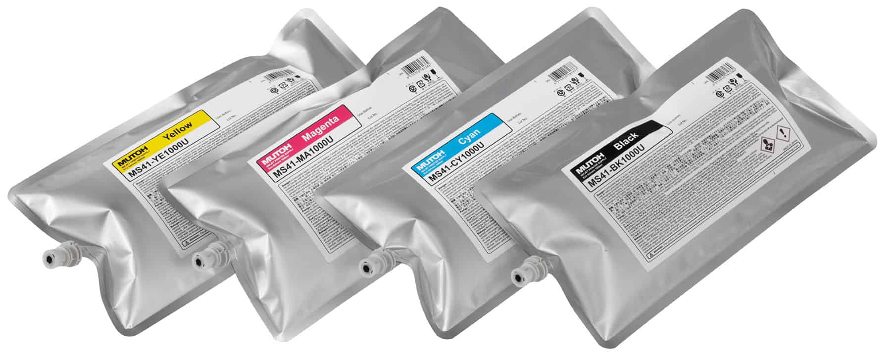 Mutoh MS41 Inks are Mutoh’s 4th generation of eco inks. The MS41 inks have been specifically developed for the piezo drop-on-demand head technology integrated in Mutoh’s XpertJet Sign & Display printers. MS41 Inks consist of highly durable colour pigments ground to nano-size level, a new blend of milder and non-aggressive solvents and a new mix of resins. The resin mix enables optimum adhesion of the pigments to the substrate and creates a uniform and smooth ink layer. Each individual colour pigment is coated by the resin mix to address the typical requirements of outdoor sign and display prints (gloss preservation, scuff, abrasion and chemical resistance) and to safeguard long-term outdoor durability of the colour pigments. Mutoh MS41 Inks have an excellent weather, abrasion and chemical resistance. UV durability without lamination is rated up to 3 years outdoor.