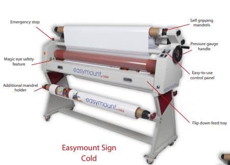 The Easymount Sign EM-S1400C is a 1420mm/54″cold wide format laminating and mounting system, ideal for heat sensitive materials including vinyls and adhesives. Designed for sign makers and print finishers, the Easymount Sign range of wide format laminating systems are entry- level simple solutions for professional cost effective finishing. Laminate signs, single banners, windows graphics, reel to reel laminates, and more. The Easymount Sign range of cold laminators also includes the EM-S1600C, a 1620mm/63″ . The Easymount Sign wide format laminators can also be configured as a hot system, with heated rollers, including the EM-S1400H and EM-S1600H models. All Easymount Sign wide format laminating and mounting systems include a take-up unit.
