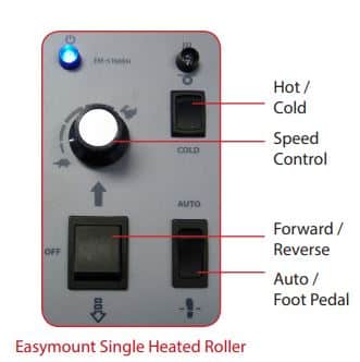The Easymount Sign EM-S1600H wide format laminating system has a laminating speed of up to 5m/16ft per minute and is able to mount to boards up to 25mm/1″ thick. The EM-S1600H has a warm-up time of ten minutes, and has a laminating temperature range of 0-45ºC/32-113ºF. The EM-S1600H has a patented manual pressure gauge handle located at the side of the laminating system, that ensures you choose the correct setting every time, quickly and easily. The roller diameter is 130mm/5 inches and the film core is 77mm/3 inches.
