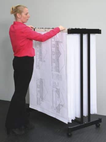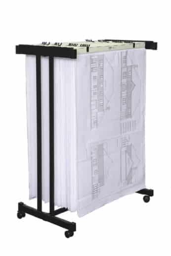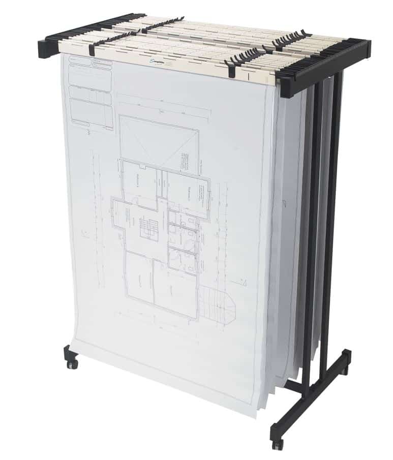 The Simplifile ECO A2 Mobile Stand is ideal for offices needing to file large quantities of plans in a variety of formats. Bundled with 8 ECO A2 Planholders, the ECO A2 Mobile Stand holds up to 800 prints, with a total capacity of up to 24 ECO A2 Planholders (up to 2400 drawings). The ECO A2 Mobile Stand features a small footprint and is mounted on castors for mobility, and brakes to keep it in place.